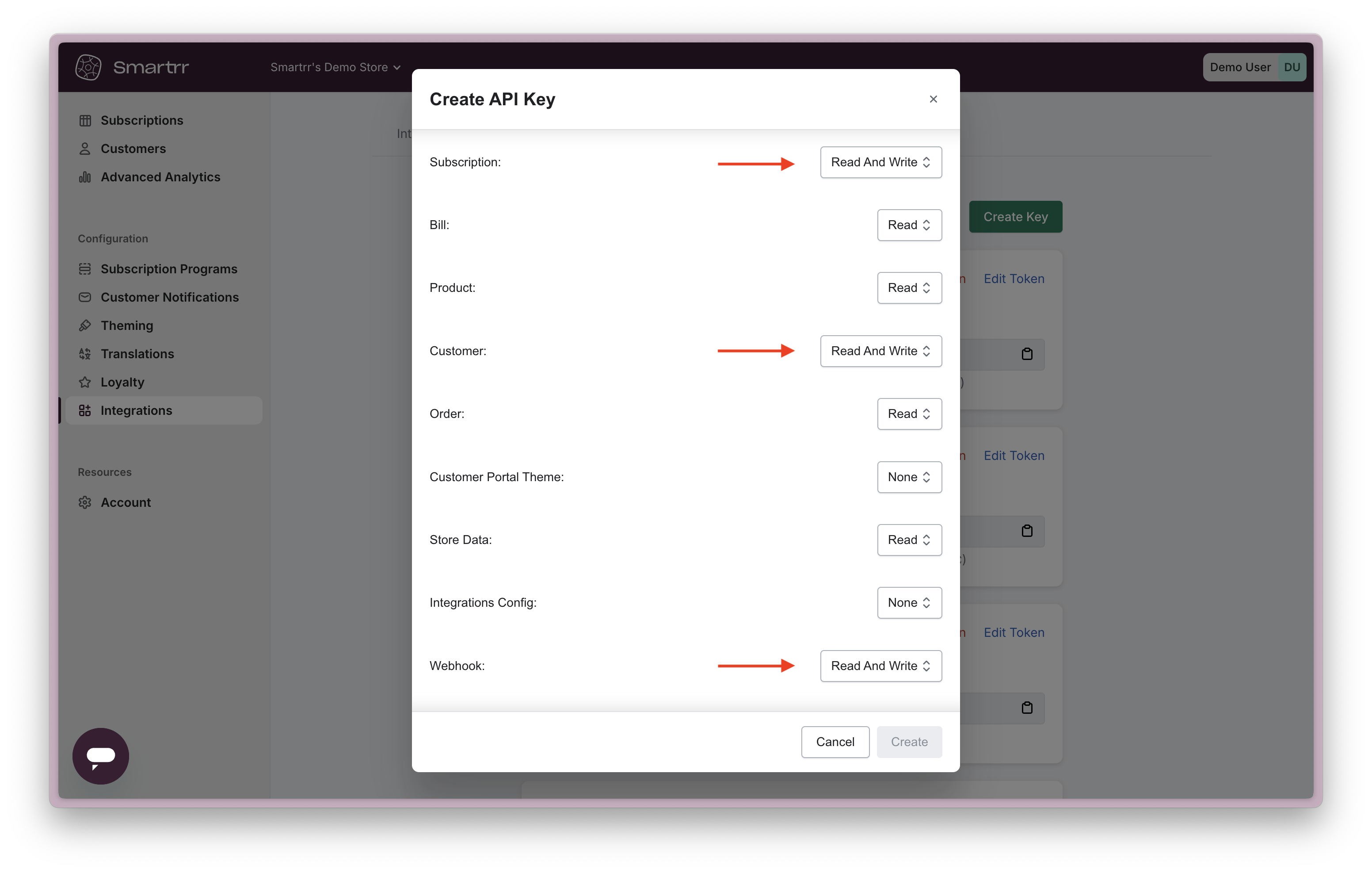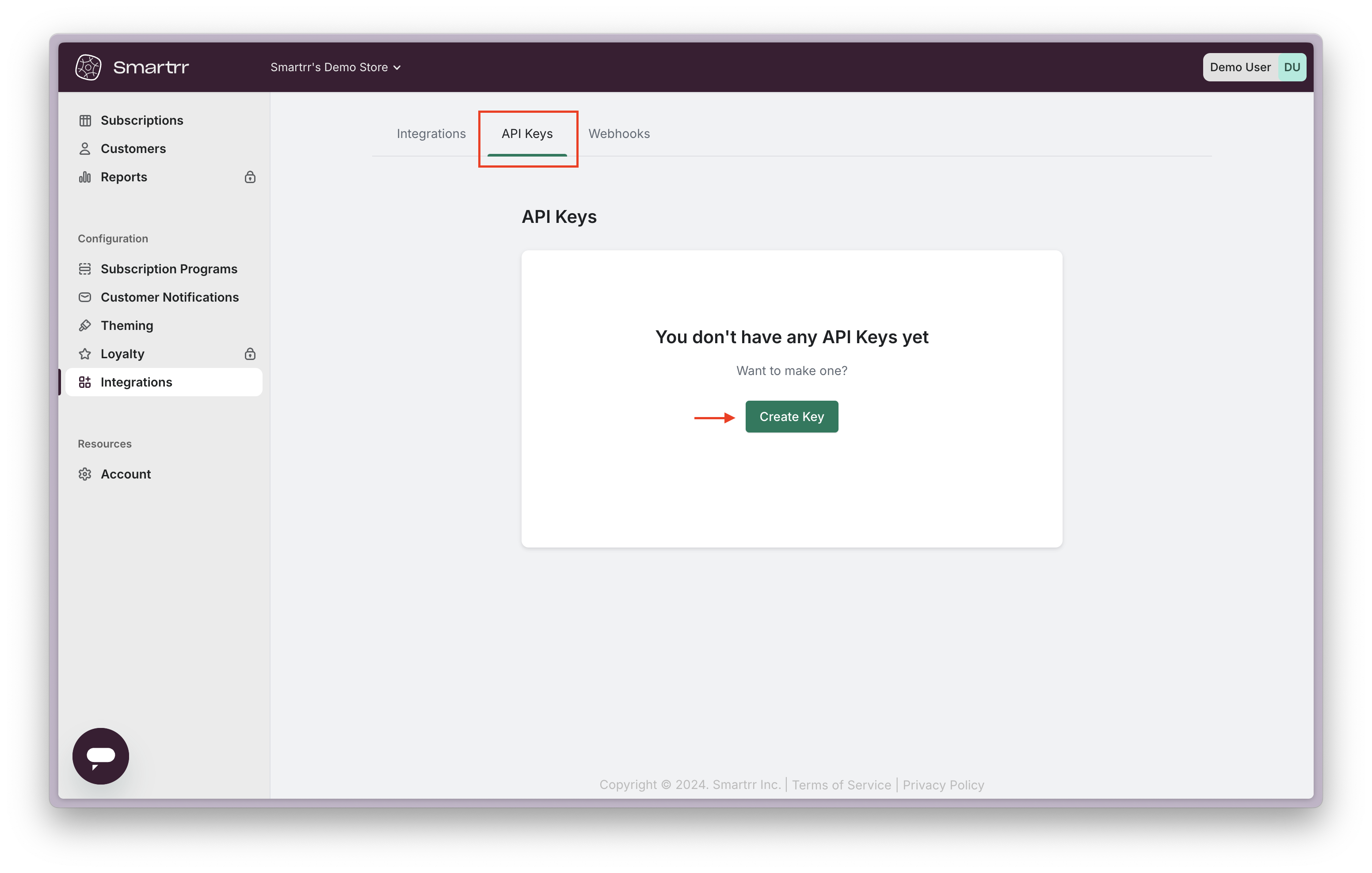 First, you'll need to generate a unique access token in the Smartrr App for Blueprint. Log into your Smartrr admin and navigate to **Integrations**. Under the **API Keys** tab, select **Create Key**.