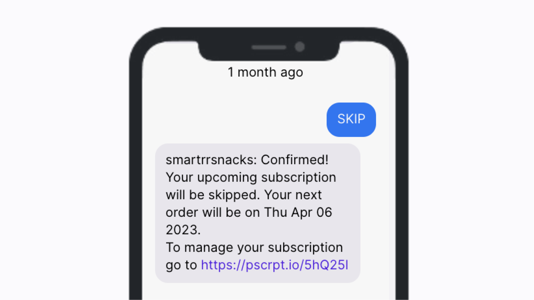 <figure><img src="https://3658670565-files.gitbook.io/~/files/v0/b/gitbook-x-prod.appspot.com/o/spaces%2FndNAuxS4koYyI8AQTpS9%2Fuploads%2Foj9lDWb5TBBlDaSNScyF%2FGitbook%20%E2%80%93%20Skip%20Subscriptions%20Postscript%20Example.png?alt=media&#x26;token=cbe95478-9c77-4581-a475-eb45f9df19dc" alt=""><figcaption><p>Example of "SKIP" response.</p></figcaption></figure>
