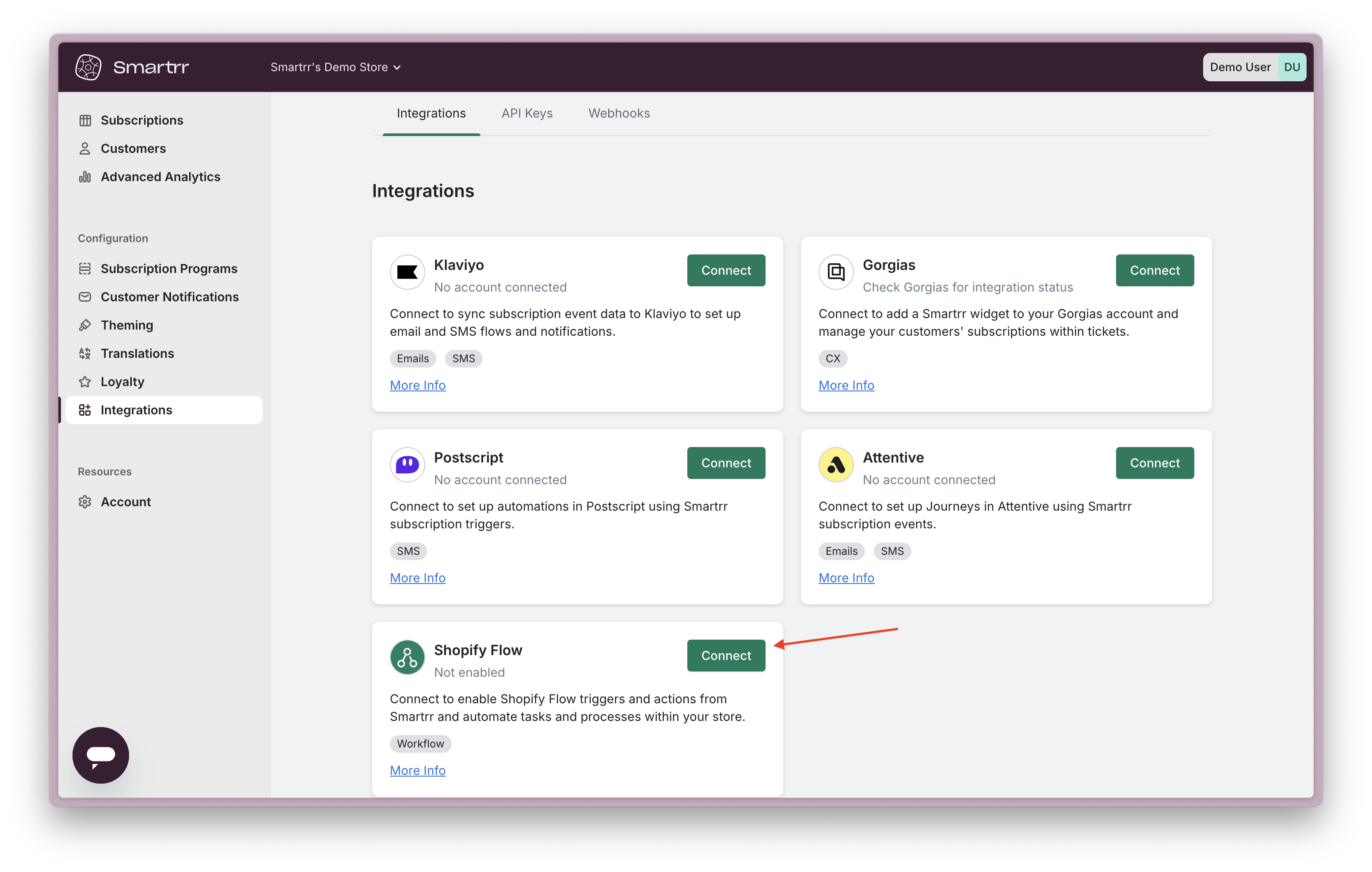 Next, navigate to **Integrations** in your Smartrr admin under CONFIGURATION. Find the block for Shopify Flow and press **Connect**. Your connection will automatically be enabled.&#x20;
