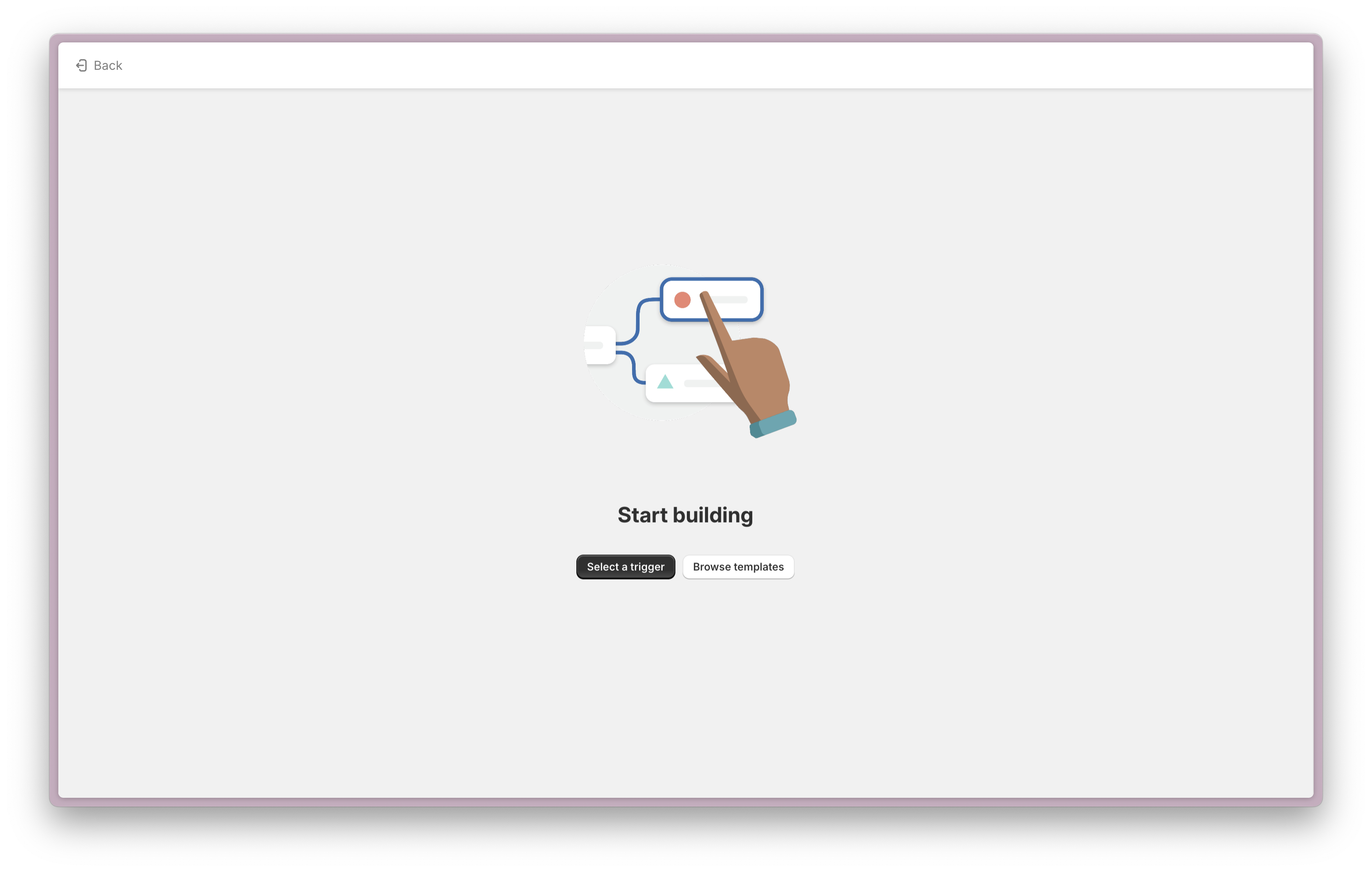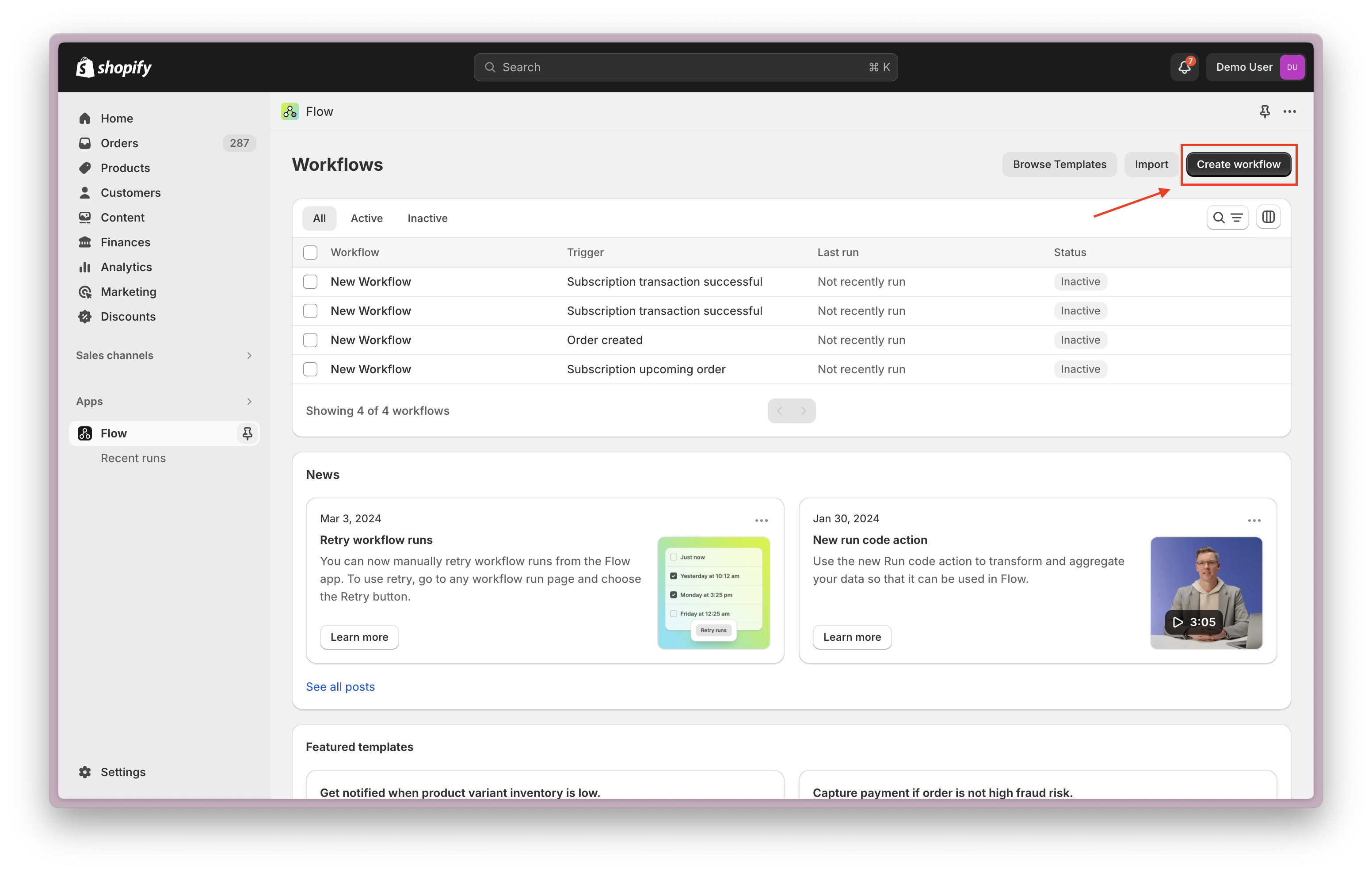 To set up a flow, open Shopify Flow from within Apps in your Shopify admin. Click **Create workflow**.