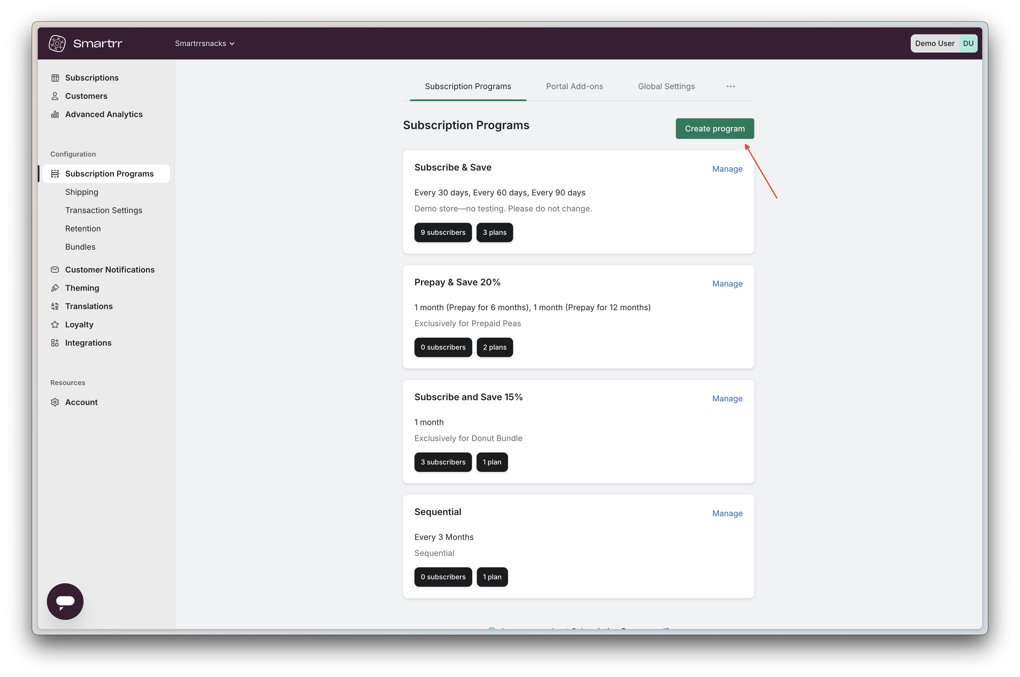 Under Configuration in the left-hand menu, click on **Subscription Programs**. Click on the button **Create program**.