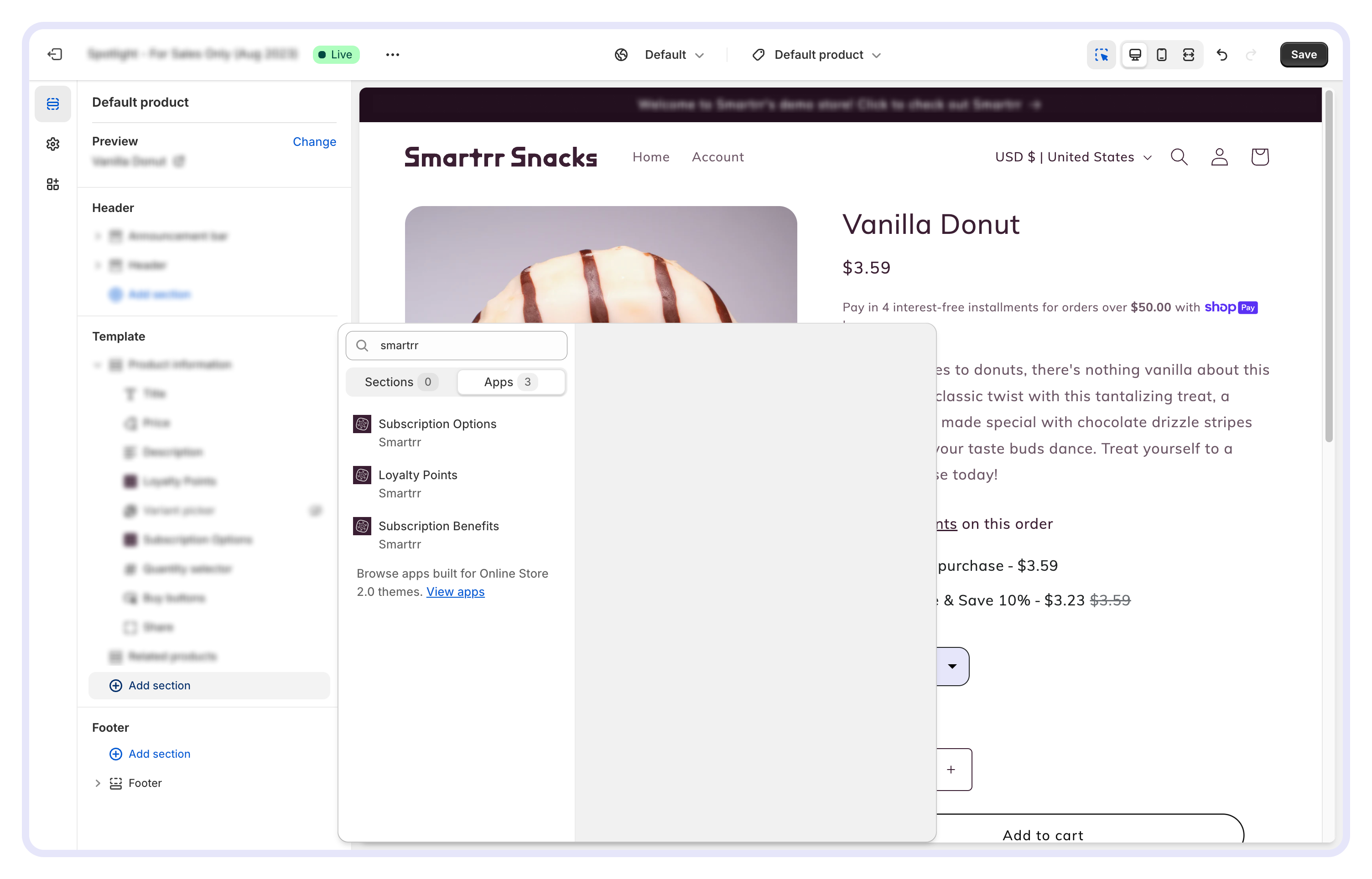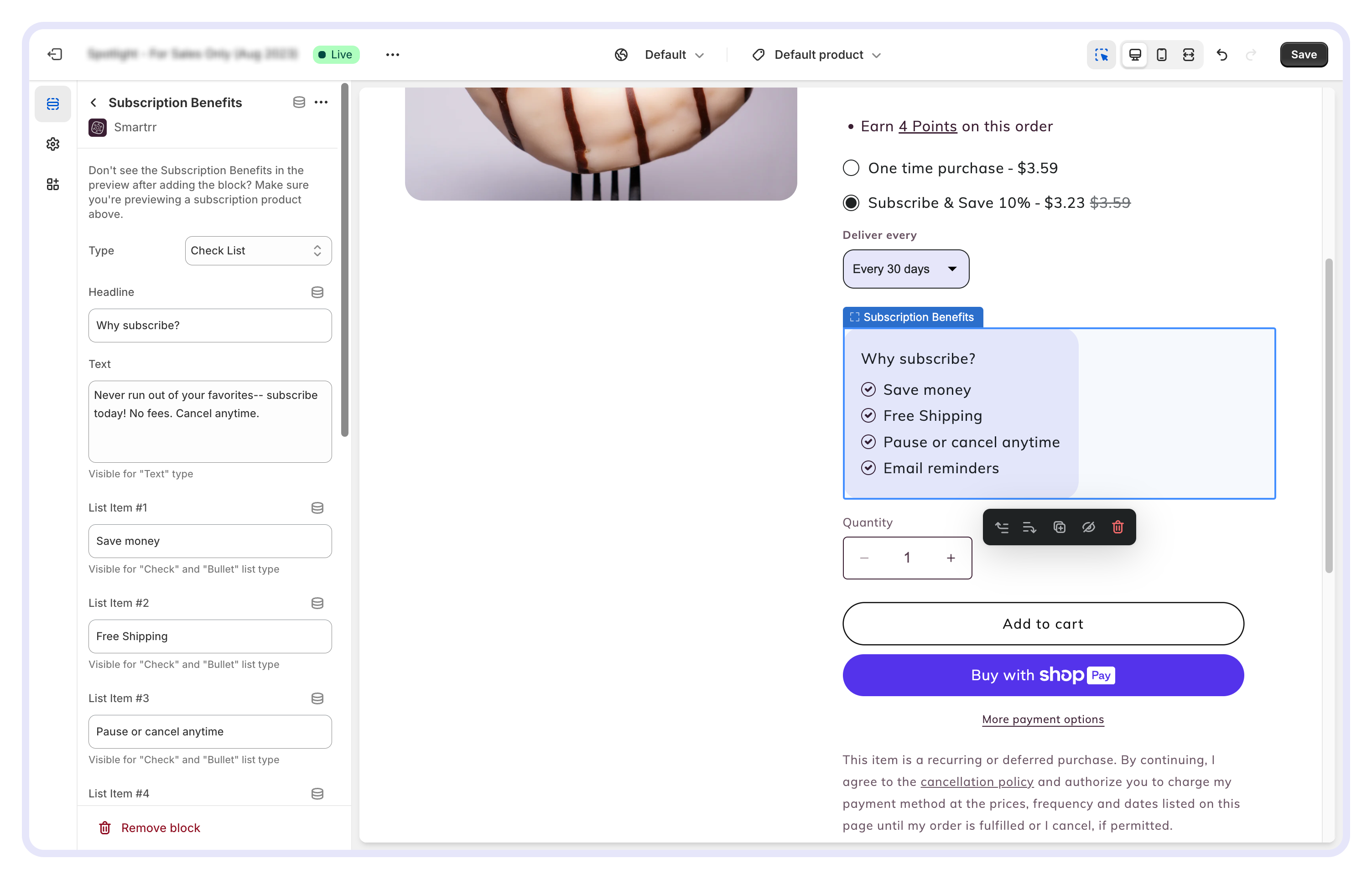 In your Shopify theme customizer, you can add the Smartrr Subscription Beneftis app block to your product pages. This widget will allow you to elaborate to customers the benefits of subscribing and can be fully customized.