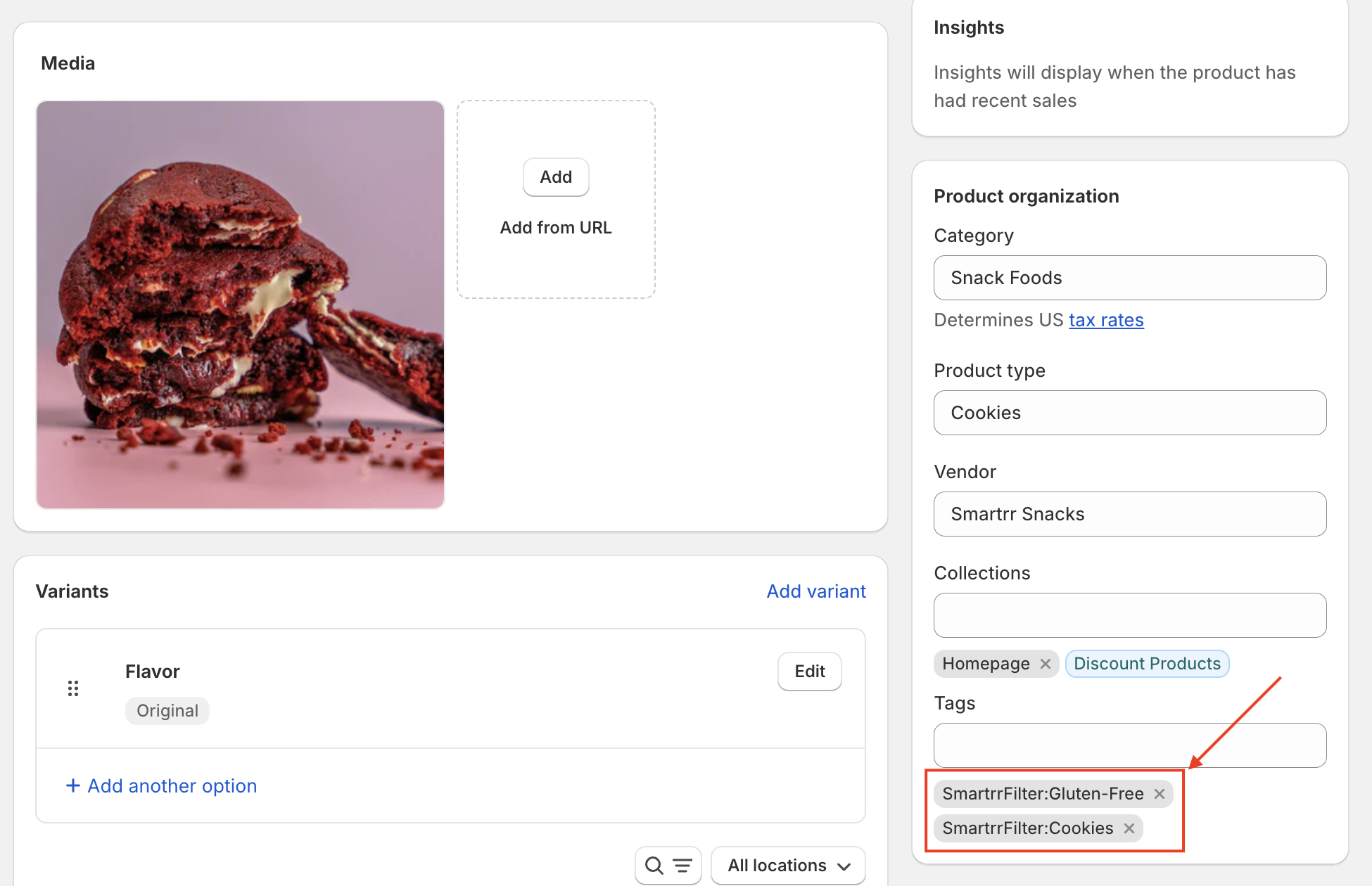 To setup a filter, go to product's page from within the Shopify Admin and create a new product tag including the Smartrr filter prefix, `SmartrrFilter`: (ex. `SmartrrFilter:Cookie`). Smartrr will pick up on these tags for applicable add-on products and will automatically create filters to include within the Add-ons section.